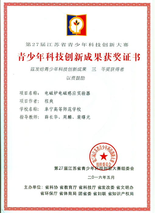 我校王睿、庞浩、程爽三同学在薛长华、裴曙光、周麟、钱光电等老师的指导下,在第27届江苏省青少年科技创新大赛中荣获喜人成绩。王睿《光电接力传声实验器》获得科技创新成果一等奖、“普颂德科”科技创新奖;庞浩《螺线管电磁炮演示模型》获得科技创新成果三等奖;程爽《电磁炉电磁感应实验器》同时获得科技创新成果三等奖。