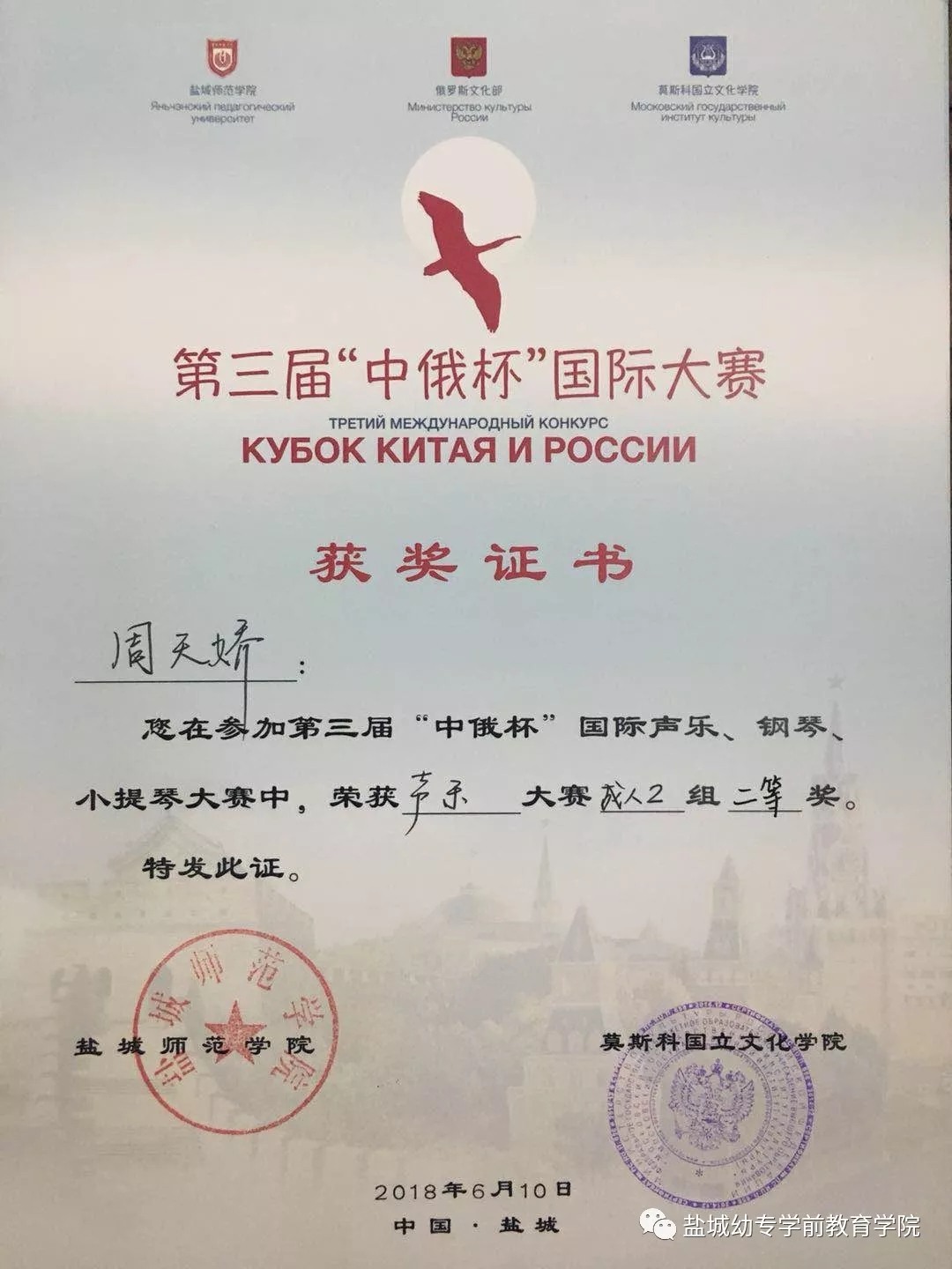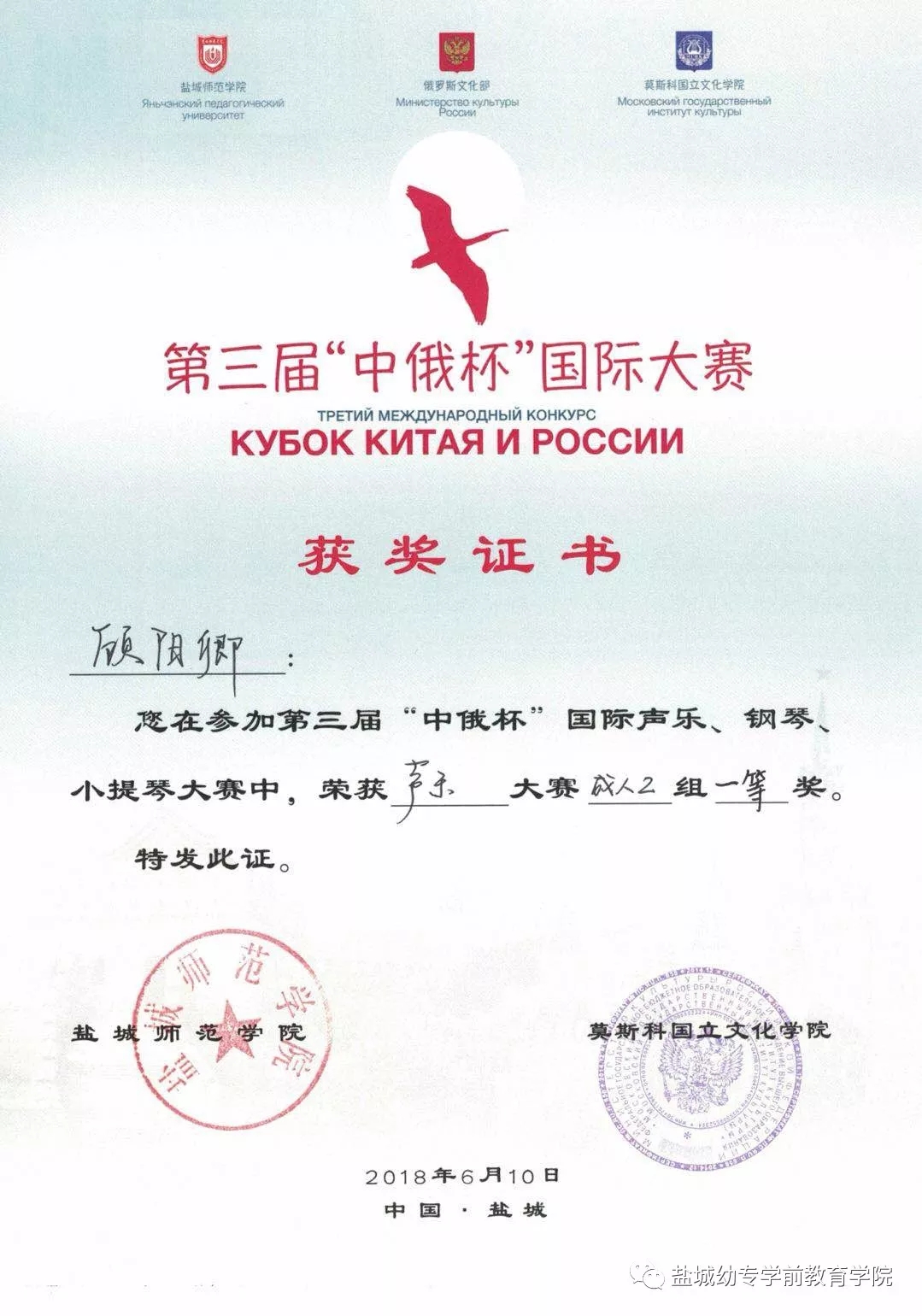 片片捷报至,累累硕果繁。我校学前教育学院在6月8日至10日举办的2018年第三届“中俄杯”国际声乐、钢琴、小提琴大赛中喜获佳绩:顾阳卿老师荣获声乐大赛成人组一等奖,周天娇老师荣获声乐大赛成人组二等奖!