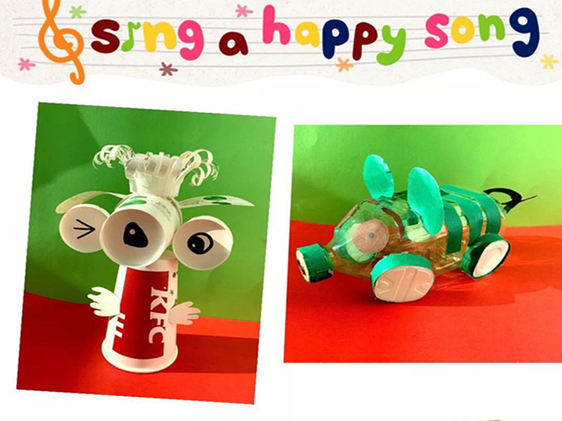 同学们利用各种废旧物品设计制作出了各种各样丰富多彩的手工作品:有饮料瓶和彩色纸板制作的卡通人物,有易拉罐制作的搞怪表情,有纸杯制作的小动物,有皱纹纸制成的礼服裙子,一件件生动形象的作品,设计新颖、构思巧妙,美观大方。