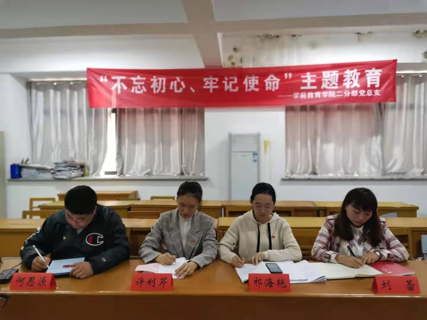 2019年11月4日下午四时,在学前教育学院二分部党总支活动室,召开“不忘初心、牢记使命”主题教育学习跟进会议,与会人员有党总支委员严东副书记,邓晓玲副书记,朱明副书记,孙晓姝组织委员,朱文会宣传、纪检委员。参加学习的还有院副科级三位同志,以及党务科员何思源老师。会议由严东副书记主持。