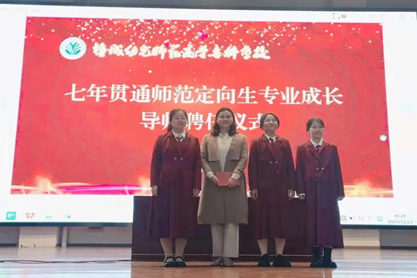 讲座结束之际,邓晓玲院长对师范定向生提出要求,希望他们制定合理的专业成长计划,鼓励他们要以“三品”幼教大先生为引领,学习彭园长兢兢业业的工作精神,热爱幼儿,热爱幼儿教育事业,不怕吃苦,努力学习,达成“铸魂、励志、强能”的目标,成长为地方幼教事业的一道靓丽的风景线。最后,我院还举行七年贯通师范定向生导师聘任仪式,聘请彭园长担任建湖籍七年贯通师范定向生的专业成长导师,邓晓玲院长为其颁发聘书,园校合作共同助力同学们专业成长!