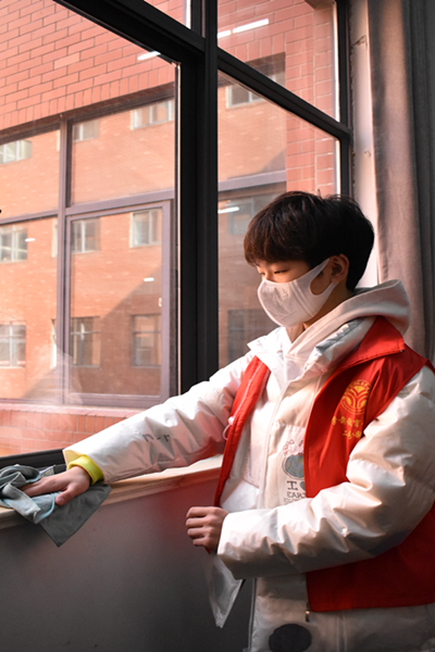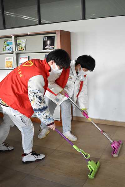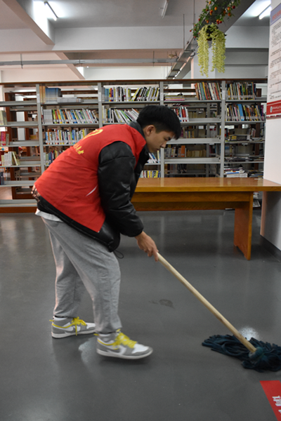 与此同时,来自学院学生会、自律会的学干和学前教育1906班的同学分别在学校学海路校区和海洋路校区图书馆进行了志愿者服务。她们挽起袖子,拎起水桶,拿起拖把和抹布,打扫书库和阅览室、擦拭玻璃和书架;他们对照分类,整理图书,归类归档;他们美化环境,传播文明,为全校师生营造了温馨的读书环境。