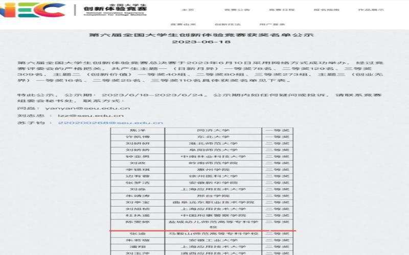 第六届全国大学生创新体验竞赛总决赛于2023年6月10日采用网络方式成功举办,经过竞赛评委会的严格把关,共产生主题一(日新月异)一等奖78名、二等奖129名、三等奖309名,主题二(创新价值)一等奖40组、二等奖80组、三等奖273组,主题三(创业无界)一等奖16名、二等奖25名、三等奖110名。