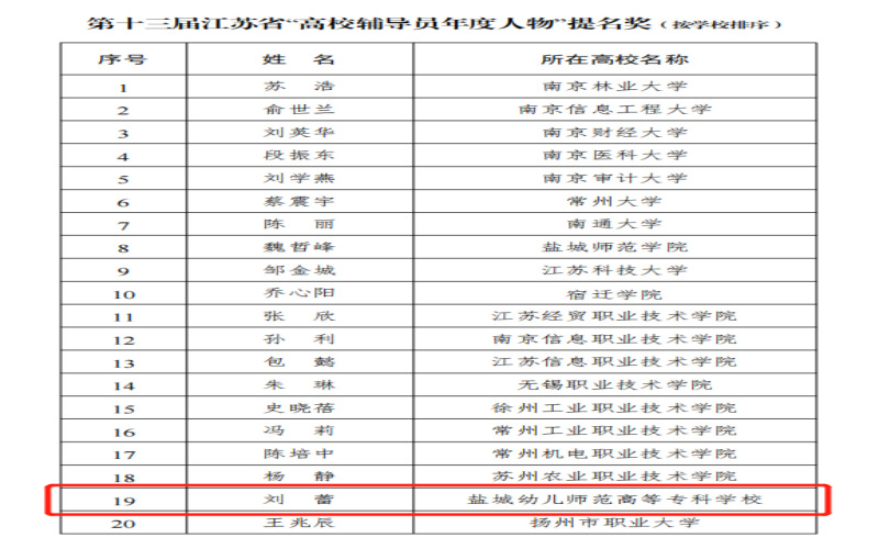 近日,第十三届江苏省“高校辅导员年度人物”评选结果正式揭晓。我院学前教育学院二分院副院长、专职辅导员刘蕾老师荣获提名奖。