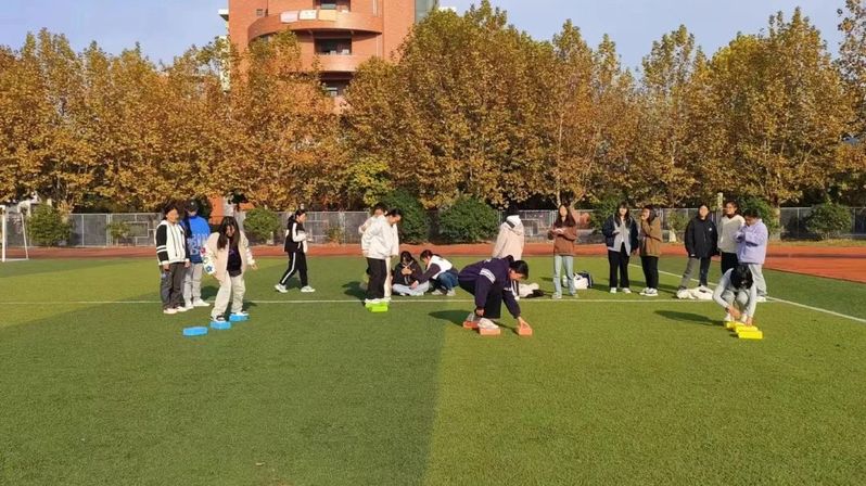 活动在轻松愉悦的氛围中开始了。活动以游戏为切入口,由部门成员带领同学们参与活动“摸石头过河”、“同心击鼓”、“袋鼠跳”,同学们全情投入、互相配合,整个操场充满了欢声笑语。