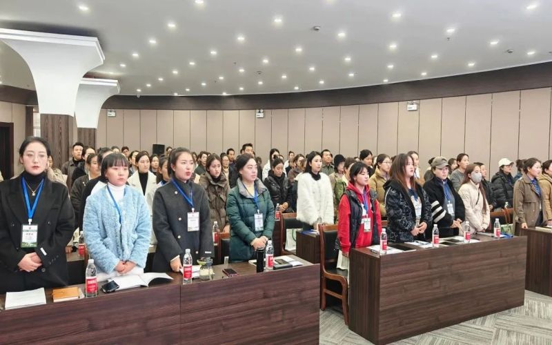 青海省教育厅教师工作处主任郭啸龙,盐城幼儿师范高等专科学校继续教育学院院长易忠兵、学前教育二分院院长邓晓玲、学前教育二分院副院长王妙甜、培训班工作团队老师及来自黄南州的100名幼儿园骨干教师园长参加了开班典礼。由学前教育二分院王妙甜副院长主持的开班典礼在庄严的国歌声中拉开了帷幕。