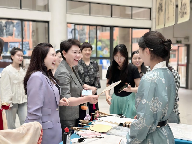 漆扇是以扇子为载体,使用漆艺中的“漂漆”的技法,利用了漆不溶于水的特质,以点、甩弹、划等手法,在水面会出图案,运用国家级非遗漆染工艺手工染制而成的艺术品。所用大漆也叫生漆,是从漆树上割取下来的材料,中国是世界上最早发现并使用大漆的国家。同学们制作的漆扇作品色彩丰富、配色和谐、肌理生动,与书画结合形成一面灵动的装饰墙。互动体验现场,参观领导与老师们亲身体验,笑声不断,气氛热烈,让展览更具吸引力。