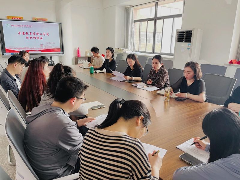 5月21日下午,学前教育学院二分院在学海路校区1号楼413会议室召开2024年毕业生第二次就业工作推进会,对我院就业工作进行了再部署、再落实、再细化。学院院长邓晓玲,党总支书记张子丽,党总支副书记、副院长刘蕾,2024届毕业班全体班主任及各班就业指导教师参加会议。会议由党总支书记张子丽主持。