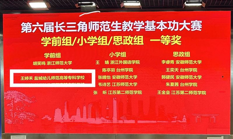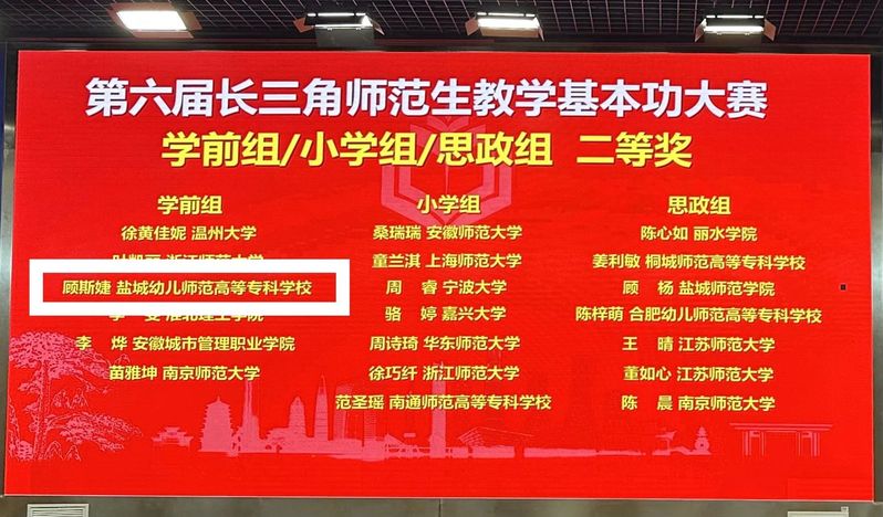 2024年11月15-17日由上海市教育委员会、浙江省教育厅、江苏省教育厅、安徽省教育厅主办的第六届长三角师范生教学基本功大赛在安徽师范大学举行,经过激烈角逐学前二分院学子王婷禾、顾斯婕分别荣获一等奖、二等奖的好成绩。本届长三角师范生教学基本功大赛的选手是由3省1市基本功大赛择优选拔产生,我校参赛选手与长三角一流高校的强大对手同台竞技。在现场展示环节,我校参赛选手沉着应对、自信流畅、答辩敏捷准确,顺利完成所有比赛项目,最终获得一等奖、二等奖的好成绩。本次比赛成果是我校历年基本功大赛中的最好成绩,也是我院教育教学成果的历史性突破!