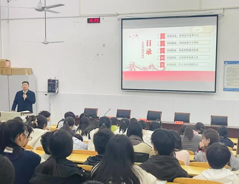谢处长开篇以《今非昔比:生活点滴里折射大变迁》为第一章,生动地讲述了在党的领导下,生活中方方面面发生的深刻变化。从衣食住行的日益改善,到教育医疗资源的逐步普及与优化,一个个鲜活的事例,如同一幅幅历史画卷在同学们眼前徐徐展开。这些看似平常的生活点滴,却深刻折射出中国共产党始终坚守的为民初心,让同学们真切感受到党的伟大力量如何在岁月长河中持续塑造着人民的幸福生活。