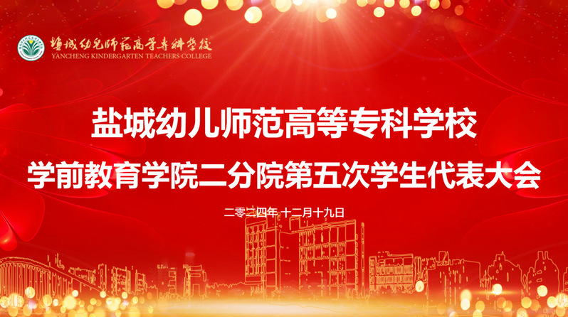 12月19日下午,盐城幼儿师范高等专科学校学前教育学院二分院第五次学生代表大会在行政楼五楼大会议室召开。学院院长邓晓玲、党总支书记张子丽、校团委副书记、副院长王妙甜、党总支副书记、副院长刘蕾、副院长许利芹、团总支书记葛鹏翔、学前教育学院二分院辅导员韩家星出席本次会议,来自全院的101名学生代表参加会议,兄弟学院学生会主席团成员列席会议。