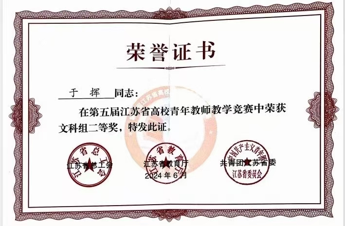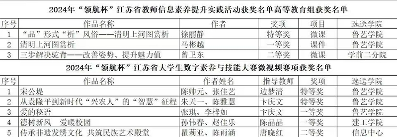 利用大数据、AI等科技创新教学形式,罗方敏、吕佳丽两位老师荣获江苏省高校微课教学比赛二等奖,曾卫东老师荣获三等奖;曾卫东老师荣获2024年“领航杯”江苏省教师信息素养提升实践活动微课二等奖。