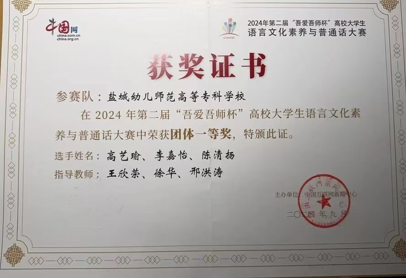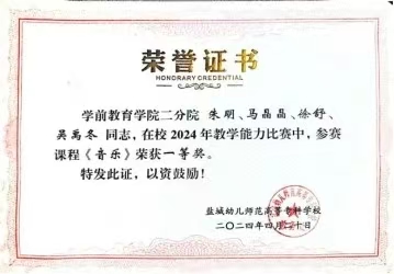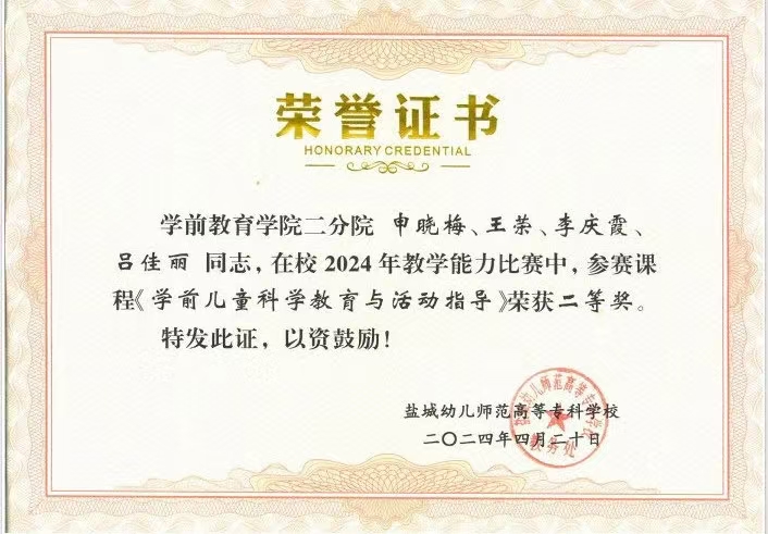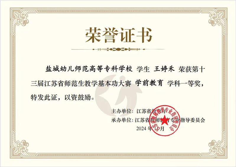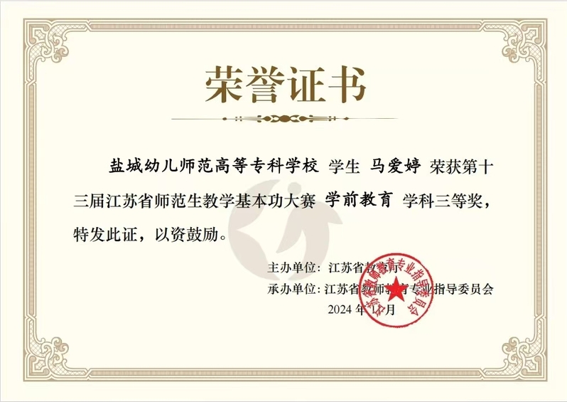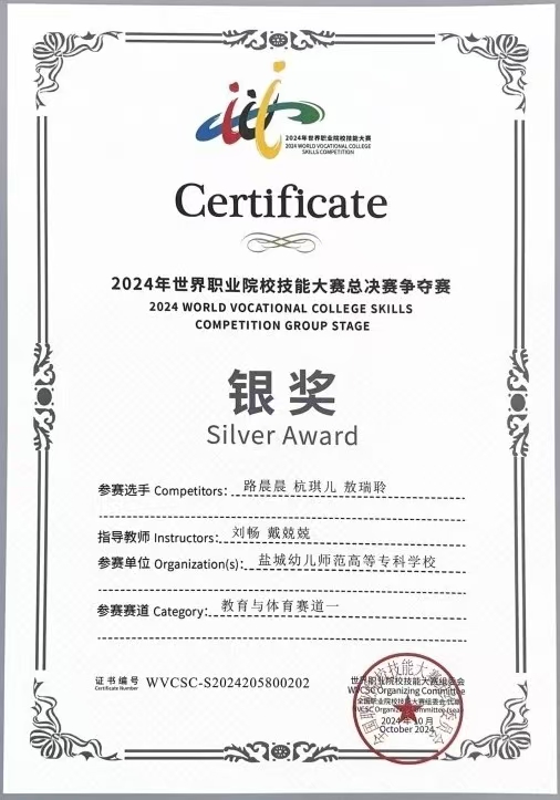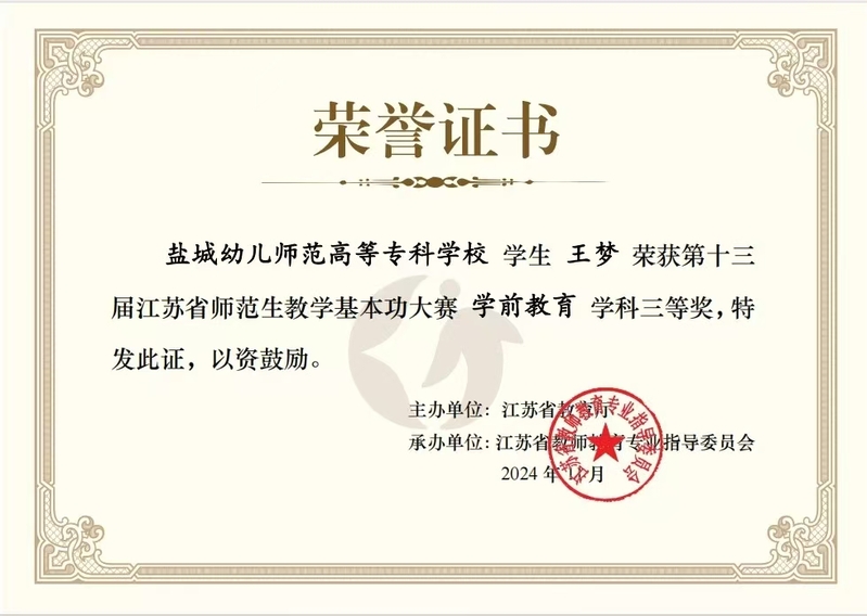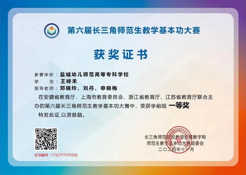 重视专业技能训练,着力培养高素质人才。在2024 年世界职业院校技能大赛总决赛中,杭琪儿同学荣获银奖;在第六届长三角师范生教学基本功大赛(学前教育组)中,王婷禾同学荣获一等奖,顾斯婕同学荣获二等奖;在第十三届江苏省师范生教学基本功大赛(学前教育组)中,王婷禾、顾斯婕两位同学荣获一等奖,王梦、马爱婷两位同学荣获三等奖。