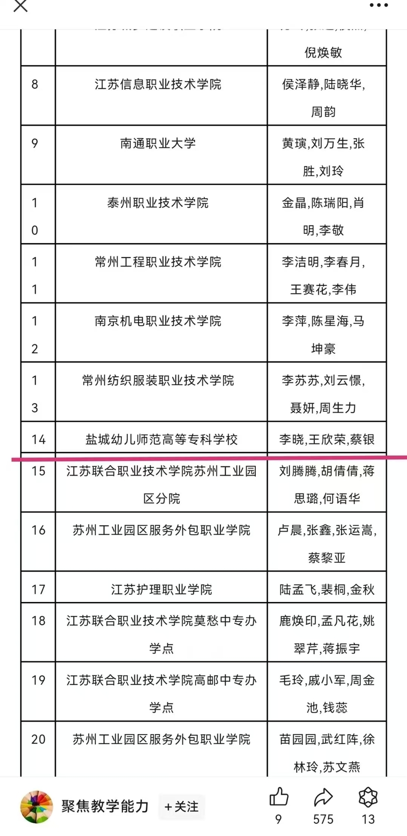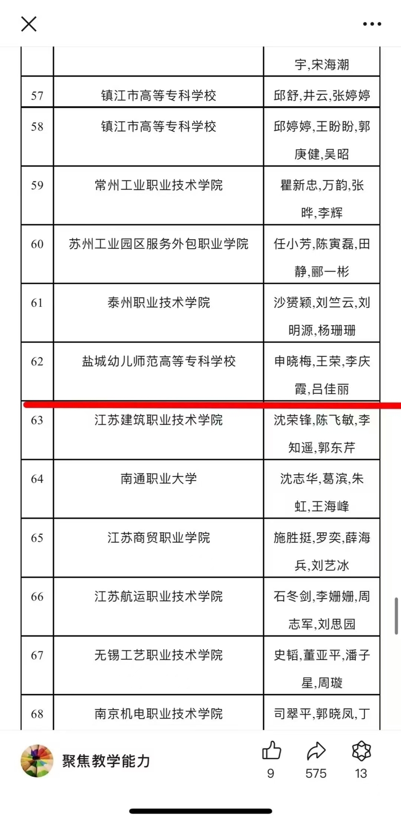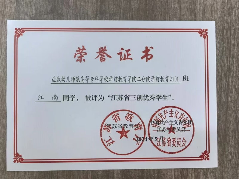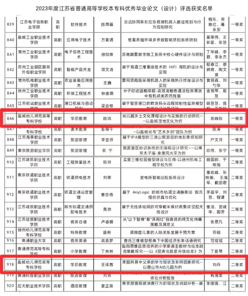 重视专业技能训练,着力培养高素质人才。在2024 年世界职业院校技能大赛总决赛中,杭琪儿同学荣获银奖;在第六届长三角师范生教学基本功大赛(学前教育组)中,王婷禾同学荣获一等奖,顾斯婕同学荣获二等奖;在第十三届江苏省师范生教学基本功大赛(学前教育组)中,王婷禾、顾斯婕两位同学荣获一等奖,王梦、马爱婷两位同学荣获三等奖。