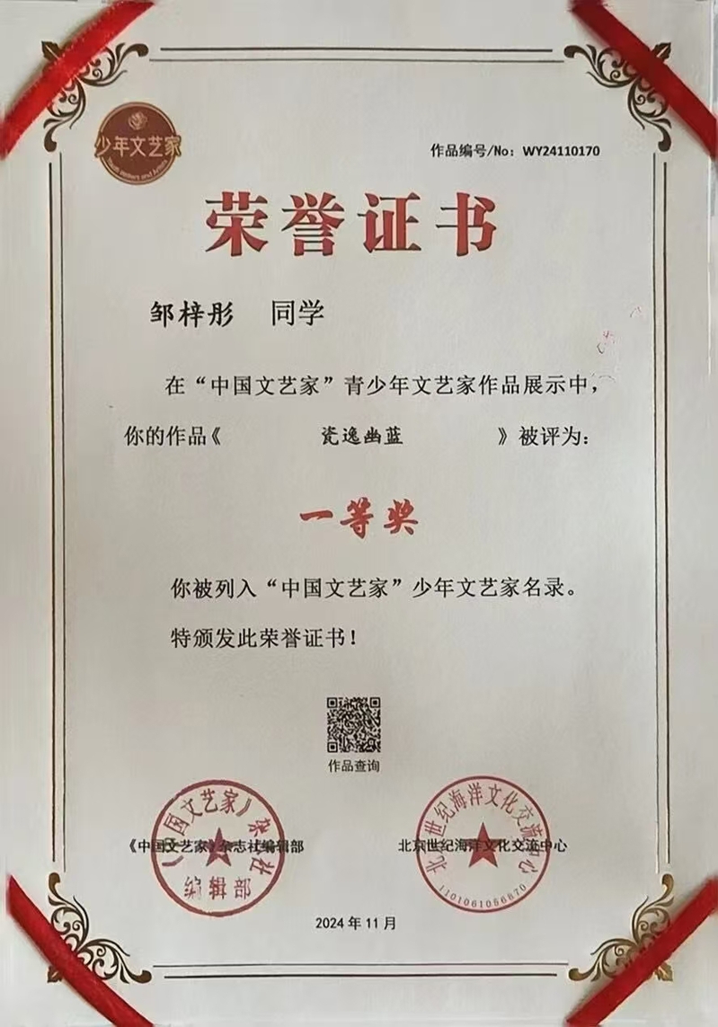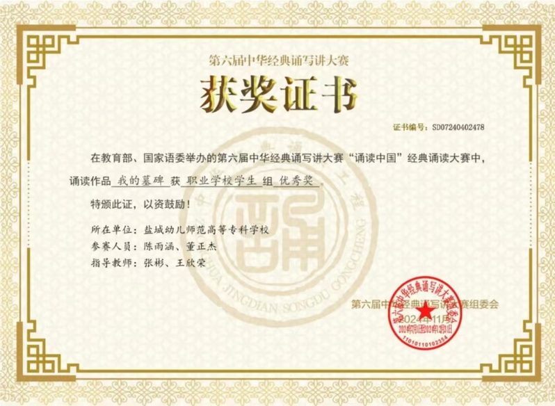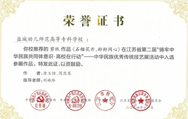 注重弘扬中华优秀传统文化,以文化人,以美育人。在教育部、国家语委第六届中华经典诵写讲大赛中,董正杰同学荣获学生组优秀奖;在2024 年第二届“吾爱吾师杯”高校大学生语言文化素养与普通话大赛中,高艺瑜同学荣获团队一等奖;在江苏省第二届“铸牢中华民族共同体意识·高校在行动”——中华民族优秀传统技艺展活动中,学院推荐的唐玉恬和周思琴同学的剪纸作品《石榴花开,籽籽同心》入选参赛作品;在“中国文艺家”青少年文艺家作品展示中,蔡锦怡同学的作品《琴瑟鹤鸣》、邹梓彤同学的作品《瓷逸幽蓝》皆荣获一等奖。