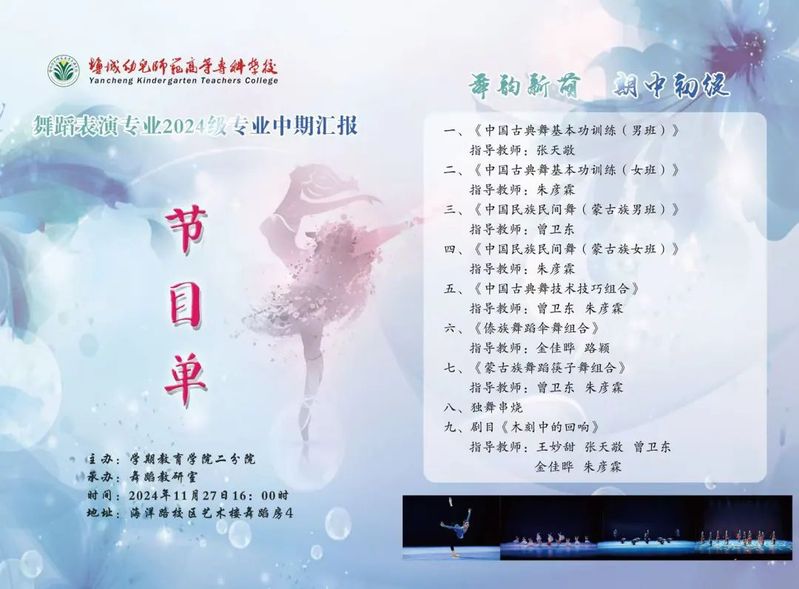 此次汇报主要评估同学们在《中国古典舞基本功训练》课程、《中国民族民间舞》课程、《剧目排练》课程等方面的学习情况。中期汇报是舞蹈专业学生学习中的重要节点,也是检查自己学习效果的机会。通过此次汇报,学生们有机会展示自己的舞蹈技能,同时也为他们今后的学习和实践提供了宝贵的经验和指导。