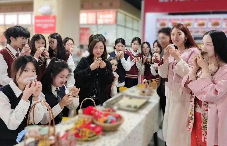 当面团制作完成后,同学们开始准备馅料。有传统的豆沙馅,也有创新的芝麻花生馅,还有鸡蛋黄、肉松馅。将馅料包裹进面团中,轻轻揉圆,一个个圆润饱满的青团便初具雏形。最后,将青团放入蒸锅,不一会儿,蒸气升腾,空气中弥漫着艾草与糯米的清香。当同学们品尝着自己亲手制作的青团时,脸上洋溢着满满的成就感,这不仅是对传统美食的传承,更是劳动成果的甜蜜回馈。