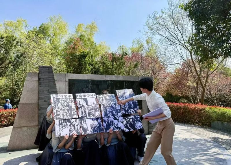 伴随着歌舞声,我们教师支部一行漫步铁军艺苑,追寻烈士们的足迹,筑牢信仰之基。沿途同学们用动听的歌声、优美的舞姿、手中的画笔、悠扬的乐器演奏、铿锵有力的朗诵等多种形式生动再现了那一段段可歌可泣的历史。通过沉浸式观看,领悟铁军文化赋予的时代精神,推动红色基因融入新时代文艺实践。