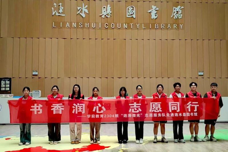 青春朝气与书香墨韵在此相遇。近日,盐城幼儿师范高等专科学校学前教育学院二分院涟水定向班(学前教育2304班)的学子们,组成涟漪微光志愿服务队返回家乡涟水,走进涟水县图书馆,开展暑期志愿服务。他们将专业所学融入实践,用热忱与担当,为家乡文化事业贡献青春力量。