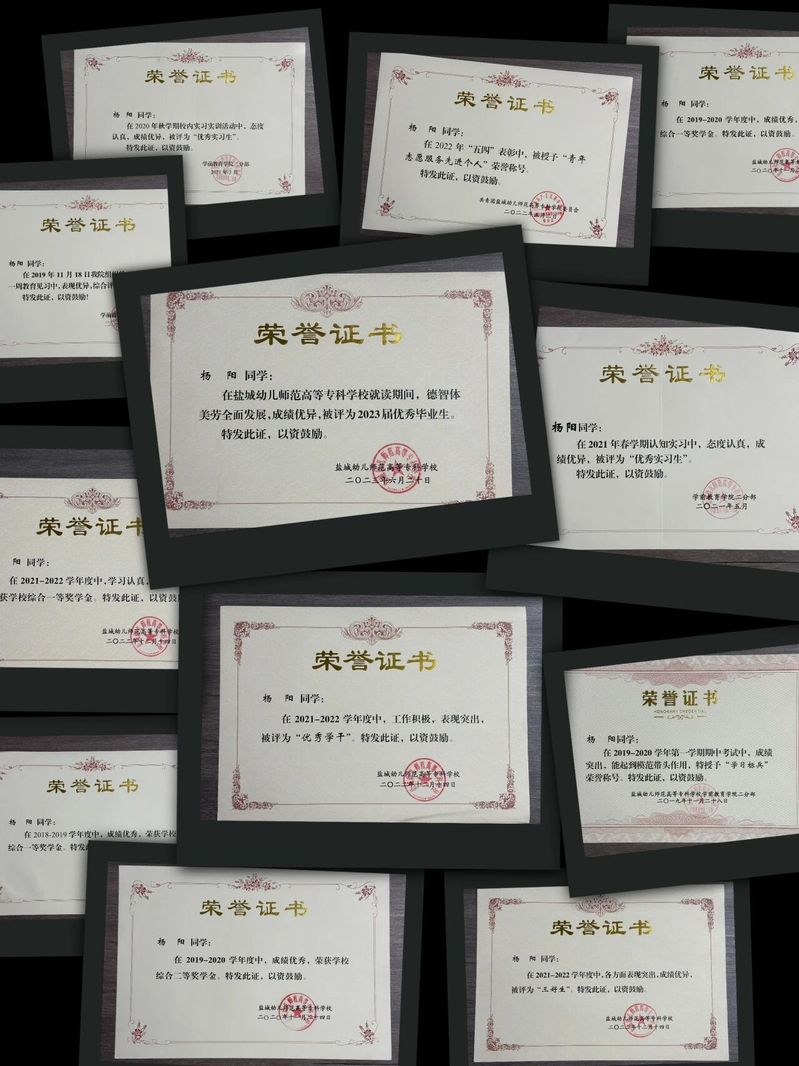 在盐城幼专学前教育学院二分院度过的五年时光,是她成长的关键阶段。曾作为班级团支书的她积极服务同学,锻炼组织协调能力;得益于学校的悉心培养和个人的刻苦努力,杨阳同学连续五年荣获校一等奖学金、三好学生及优秀学生干部等荣誉奖项。这些奖项不仅是对她学业成绩的肯定,更是对她勤勉态度、服务精神和全面发展的褒奖,为其后续深造奠定了坚实基础和人格底蕴。