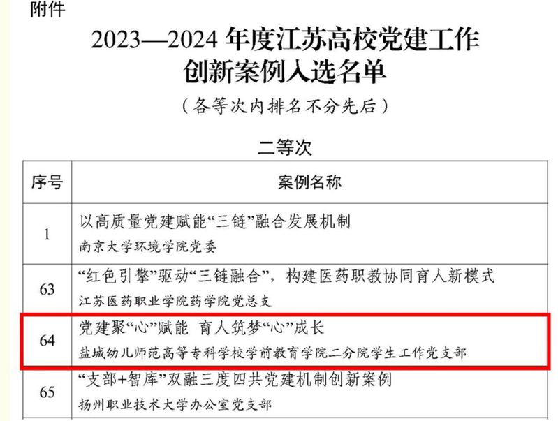 近日,中共江苏省委教育工委印发《关于公布2023—2024年度江苏高校党建工作创新案例名单的通知》,盐城幼儿师范高等专科学校学前教育学院二分院学生工作党支部申报的案例《党建聚“心”赋能 育人筑梦“心”成长》,经高校推荐、专家评审等多环节遴选,成功入选机制创新类二等次案例,这是学生工作党支部党建工作成果获得的省级重要认可!