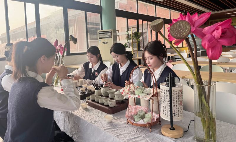 老师们指导同学们根据花材的形态搭配色彩,如何调整花枝高低营造层次感,让普通的花材在手中变成一幅幅立体的“双节图景”——或许是红、黄玫瑰相配,藏着“家国红火”的祝福;或许是荷花配莲蓬,和和美美,晕染“秋日雅致”的氛围。无需追求繁复,哪怕只是三两枝花草插入素瓷瓶,也能把双节的诗意搬进室内,多一份自然的喜庆。