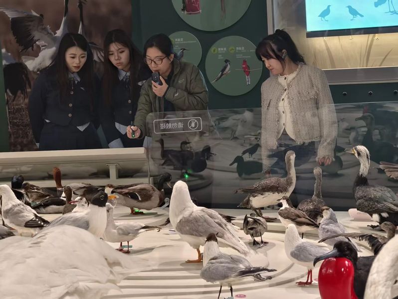 “生灵家园”展区是这份生态答卷中最动人的篇章,每一处都藏着家乡土地上的生命奇迹。憨态可掬的麋鹿标本前,特殊教育25班同学并肩伫立,多媒体屏幕上正播放着39头麋鹿引种回归的纪录片——镜头里,麋鹿踏过盐城的浅滩、啃食家乡的嫩草,种群从寥寥数头壮大到8000余头,画面一帧帧闪过,大家眼中满是震撼与赞叹。同学们将手掌轻轻贴在触摸式互动屏上,指尖划过,屏幕里的勺嘴鹬便扑棱着翅膀在滩涂里觅食,那独特的楔形小嘴啄探着家乡的泥土,软乎乎的触感透过屏幕传来,让同学们眼里泛起亮晶晶的光。旁边的展柜里,震旦鸦雀的标本灵动小巧,东方白鹳的羽翼洁白如雪,同学们拿出彩笔,在纸上细细画下喜欢的生灵,线条虽稚嫩,却满是对家乡生命的纯粹热爱。734种野生鸟类的鸣唱在空间中交织,与同学们的呼吸声相融,汇成了独属于盐城少年与家乡自然的静谧交响。