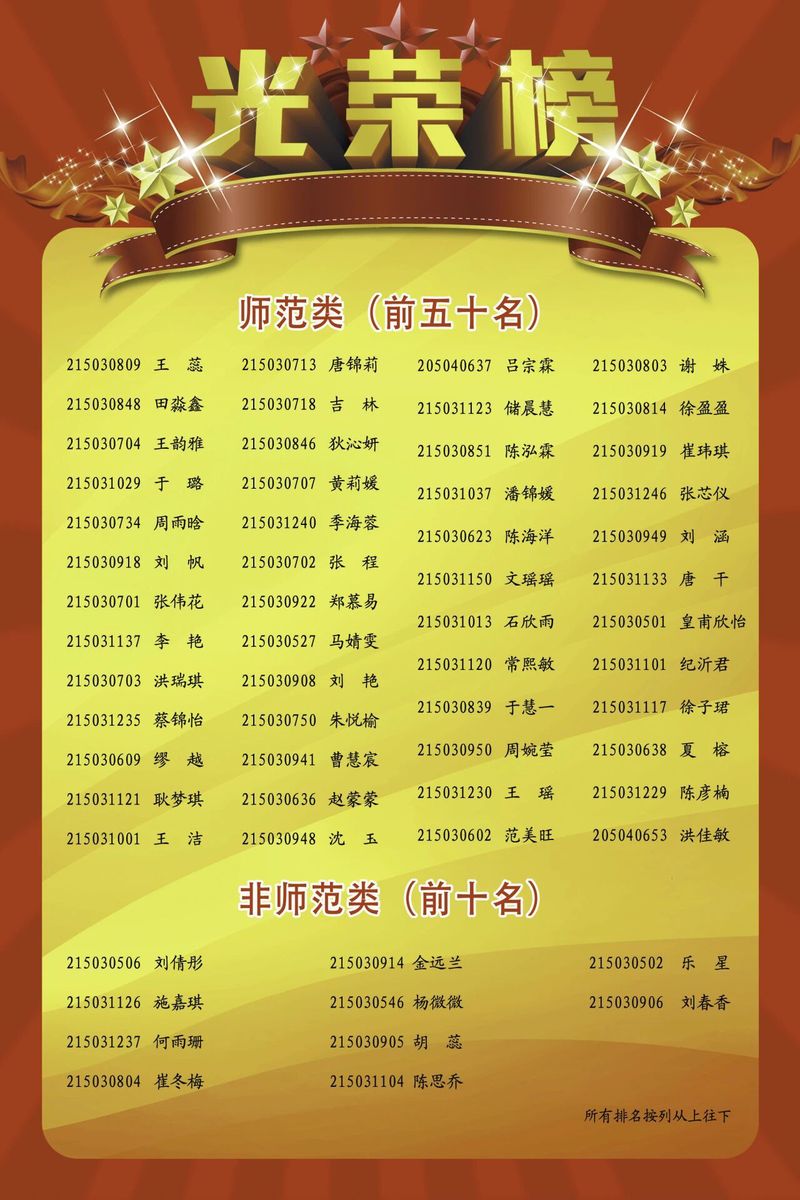 根据模拟考试文化总分排名,学院对师范类前50名、非师范类前10名的同学予以表彰,现将光荣榜公布如下:
