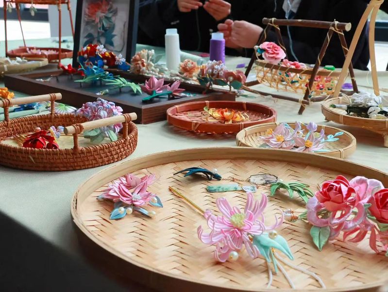 除了课堂练习,同学们还主动开启“实践闯关”,以多样展览形式让缠花非遗鲜活落地:有的小组合作完成一套“梅兰竹菊缠花图鉴”,整齐陈列,通过展板搭配作品的形式,利用缠花与传统文化结合,在分工协作中打磨技艺,也让观展者读懂非遗里的时光韵律;有的同学将录制的简易缠花教程制作成趣味视频,在幼儿园实习过程中,让小朋友也能近距离感受缠花魅力;还有的同学带着发簪、头冠、耳坠等缠花作品,切身展示,吸引师生驻足,让传统技艺在展览中焕发新生。