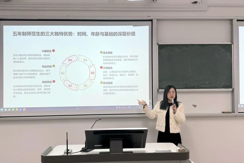 1226日下午,学前教育学院二分院杨静老师以《少子化时代学前师范生的成长指南》为题开讲,为五年制师范生精准对接行业需求、明晰成长路径指点迷津。