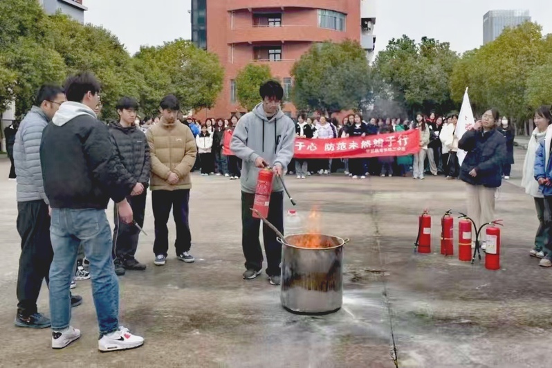 随着警报声响起,烟雾弹燃烧,消防应急疏散演练活动正式开始。同学们弯着腰,捂住口鼻,按疏散路线有秩序地迅速撤离到宿舍周边的安全地带,随后各班迅速清点人数,确保所有学生抵达安全区域。陈庚远处长结合近期江苏省发生的火灾实例再次强调了消防安全的重要性,希望同学们树立安全无小事的思想,切实增强消防意识,掌握安全逃生方法。随后,他介绍了灭火器的正确使用方法和注意事项,模拟火灾场景,同学们亲身体验了灭火的过程,掌握了灭火器的正确使用方法。